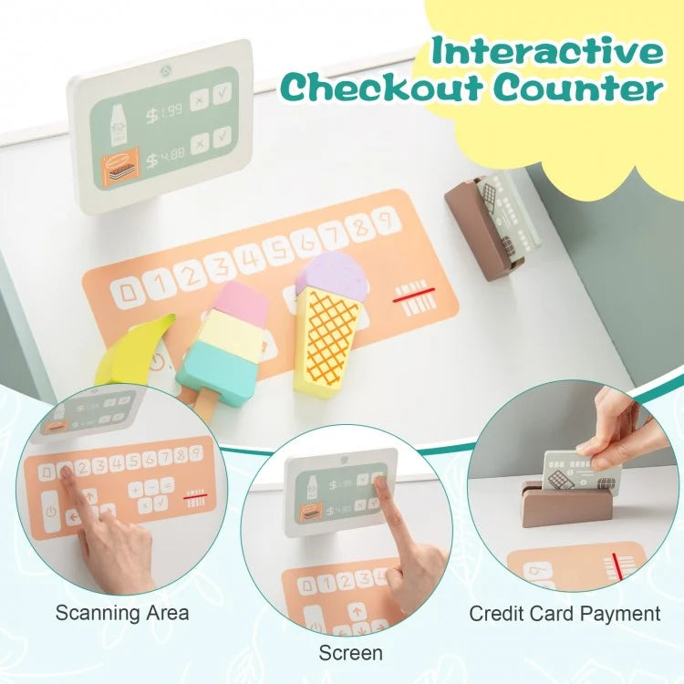 ● Realistic Cashier Experience: Designed to simulate a genuine supermarket experience, the wooden supermarket includes a checkout counter featuring a scanning area, screen, and credit card payment option. This provides an ideal learning opportunity for little cashiers to develop early math and financial awareness.