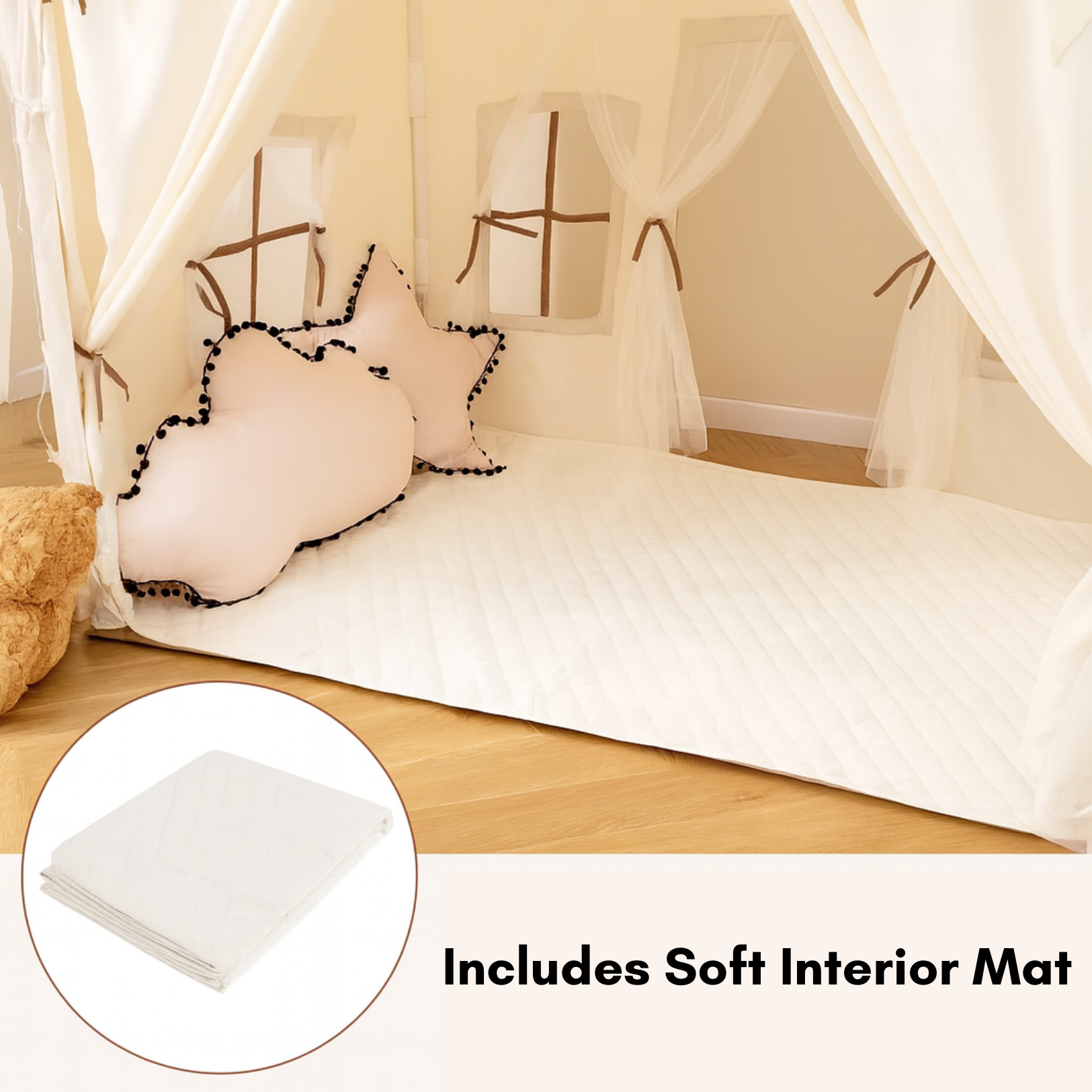 Transform any room into a magical retreat. Add this beautiful Play Tent with Lights, Garland & Mat to your home today — where safe play meets endless imagination.