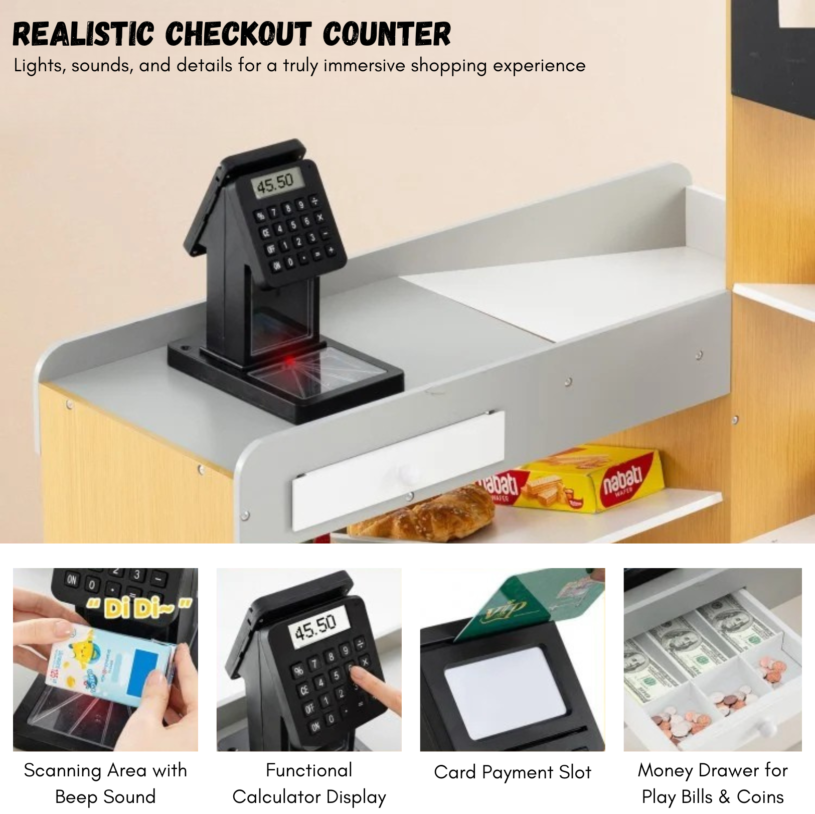 Thoughtfully crafted from safe, non-toxic materials, this play set meets both ASTM and CPSIA safety standards, ensuring hours of worry-free fun. With two chalkboards for prices or grocery lists, a real rolling shopping cart, a working cash register, a price scanner, and a built-in calculator, every detail invites your child into the wonderful world of imaginative play.
