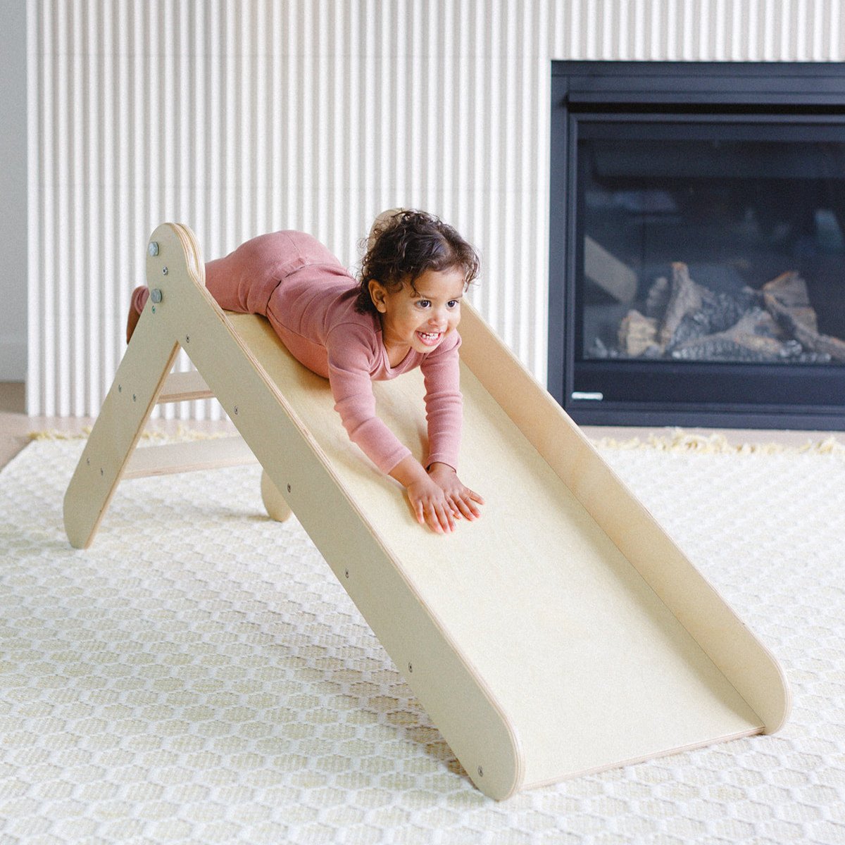 Introducing the 2-in-1 Slide N' Sketch, a large indoor wooden play set made from premium Baltic Birch, designed to keep toddlers and young children entertained through active and creative play. This 2-in-1 wonder not only functions as a fun slide but also transforms into a sleek whiteboard easel, offering endless hours of learning and imagination.
