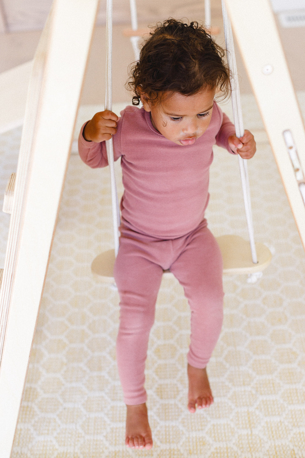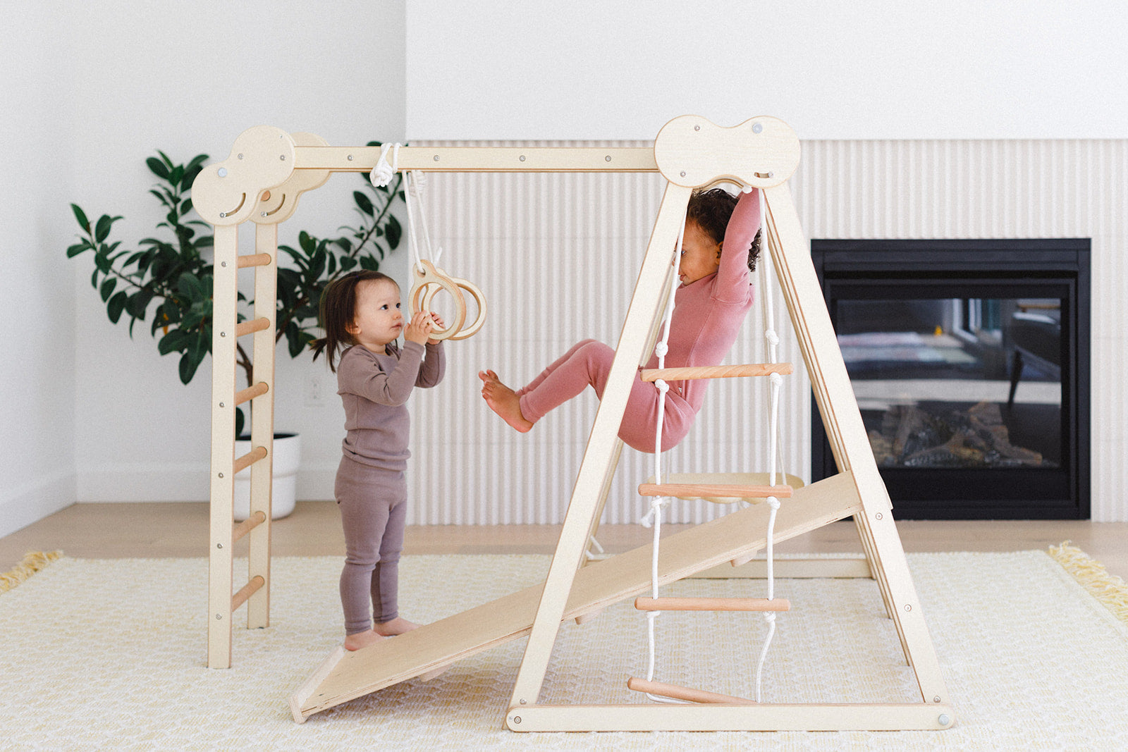Built from durable, natural wood and finished with child-safe materials, this play gym combines physical development with imaginative fun. It supports gross motor skills, balance, and confidence—all while keeping kids off screens and moving their bodies. With six exciting features, there’s always a new way to play.