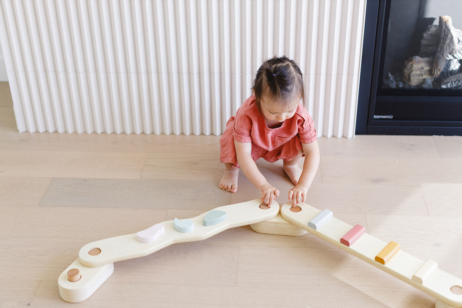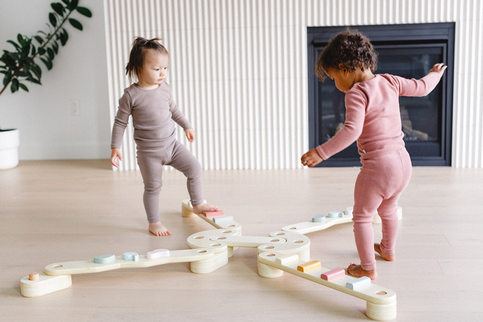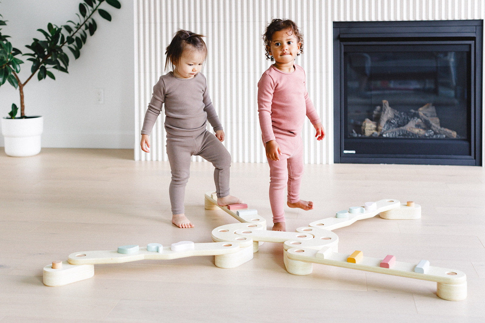 Two children playing with a wooden seesaw in a room with a fireplace and plant.