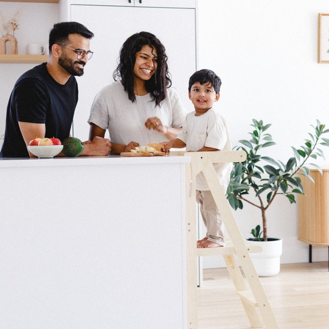 This adjustable toddler learning tower is designed to grow with your child from 3 to 9 years. It features three platform heights, a durable Baltic Birch build, and a space-saving folding design that stores flat in seconds!
