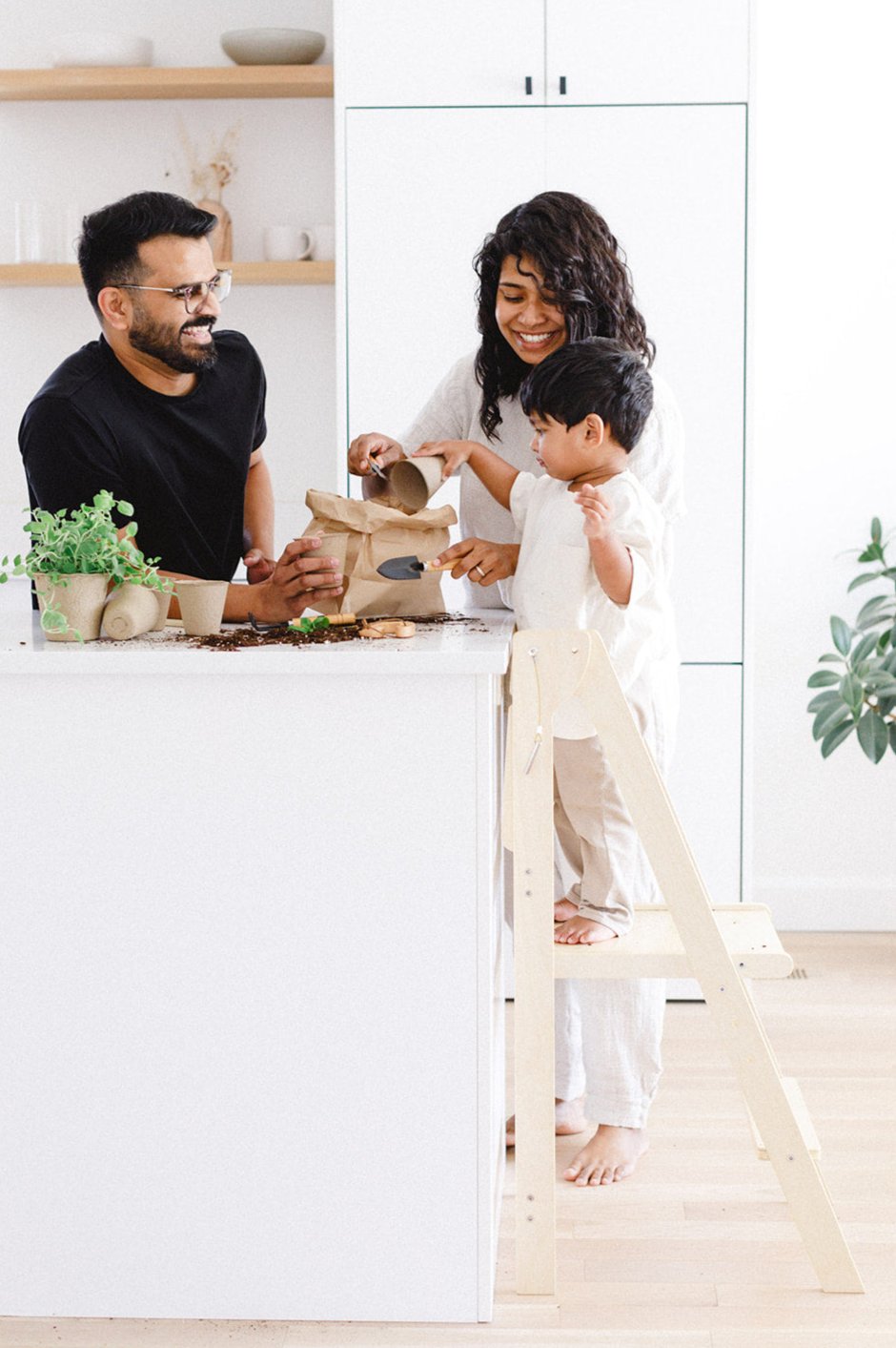 Turn everyday tasks into learning moments with our Fold N' Store Learning Tower—perfect for helping toddlers safely reach counter height and join in on cooking, cleaning, and more.